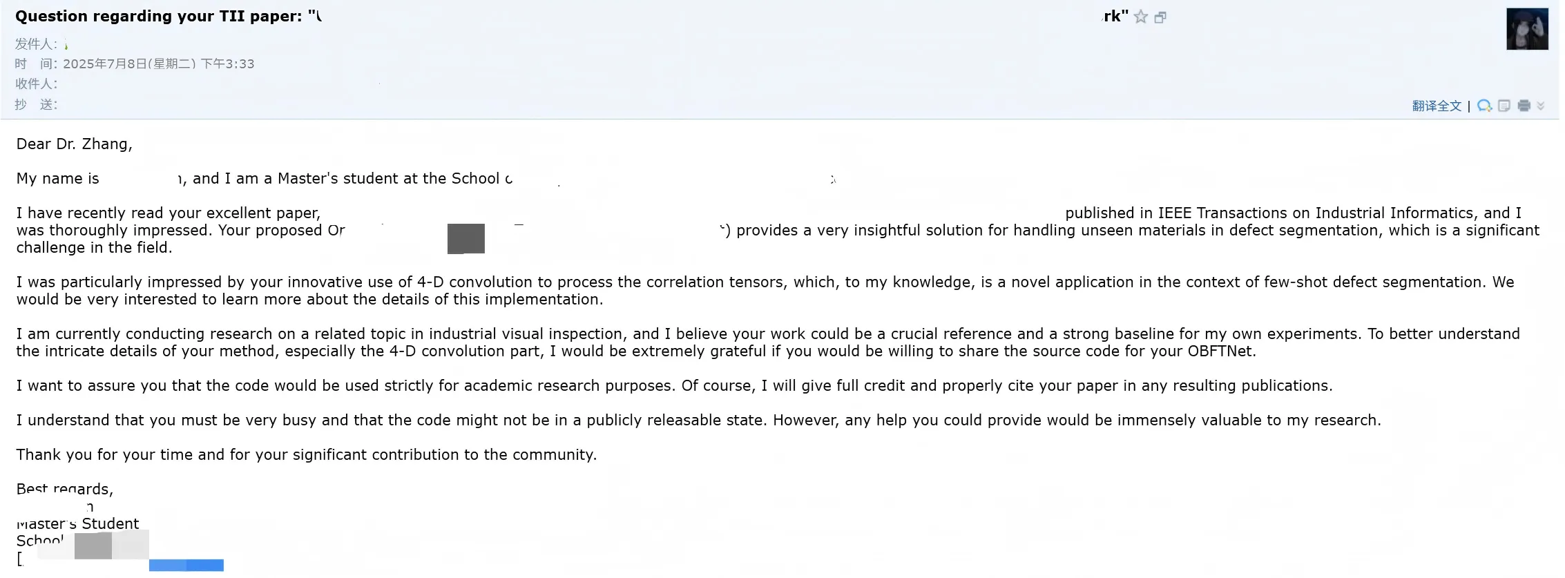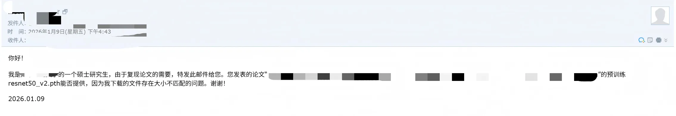 第一次收到别人关于我论文复现的相关邮件。